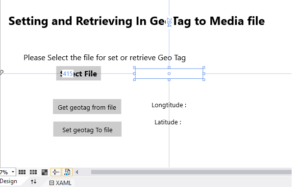 Add the following controls for selecting the file and displaying the GeoTag Information. Add the TextBlock and Button Controls and change the Name and Text Property of each.