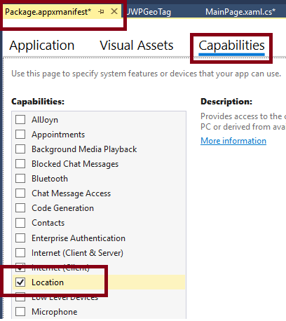 Go to Project Menu, select UWPGeoTag Properties -> Package.appmanifest -> Capabilities and enable the "Location" option.