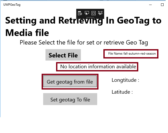 - <TextBlock x:Name="tblTitle" HorizontalAlignment="Left" Margin="19,18,0,0" Text="Setting and Retrieving In GeoTag to Media file" TextWrapping="Wrap" VerticalAlignment="Top" FontSize="36" FontWeight="Bold" />