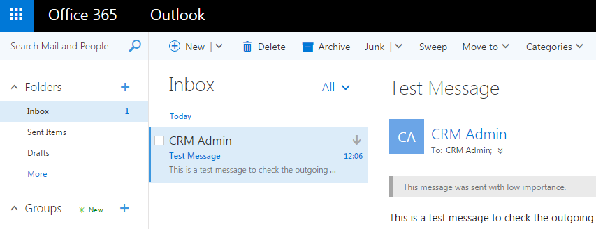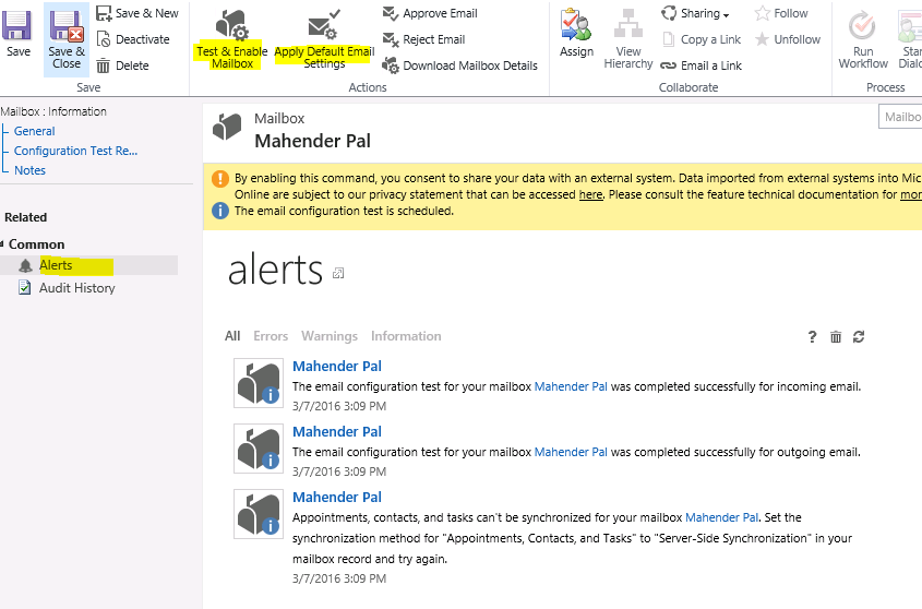 9. Open CRM user mail box and click on Approve Email button on command bar and click on Test & Enable Mailbox button.