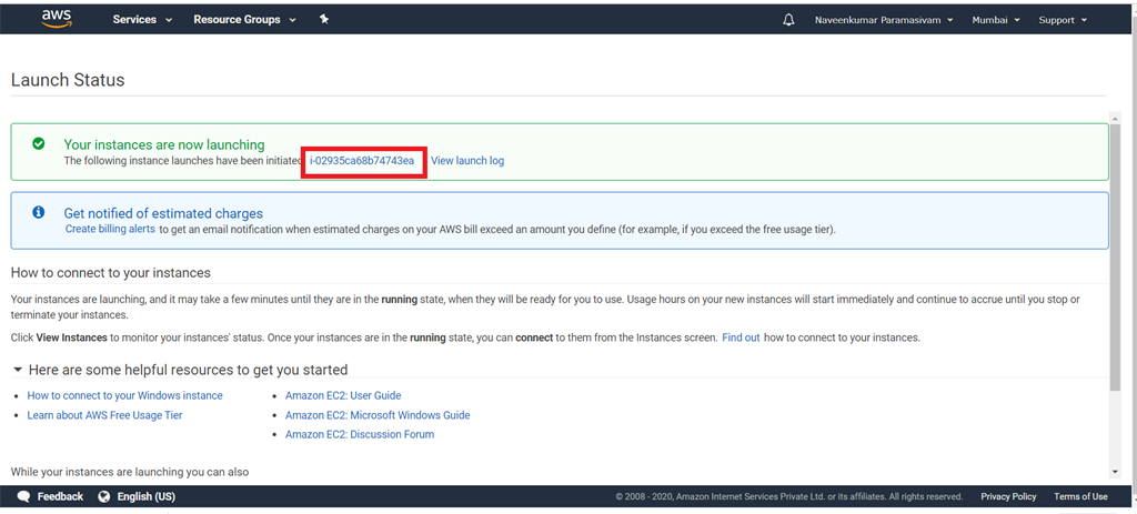 Click the “Launch Instance” button in the prompt window. It's redirected to the launch status page.