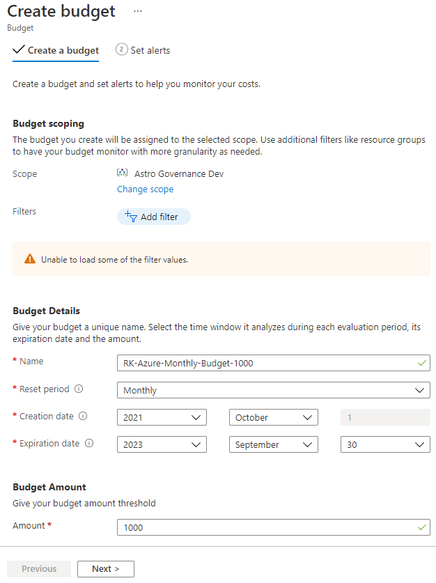 Fill in the details like budget Name, Reset period, Creation date, Expiration date, and Amount and click next. In the given screenshot I am putting $1000 for my budget, you can choose according to your subscription.