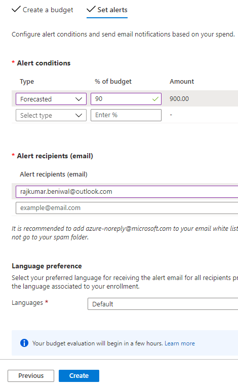 Now setup an Alert for notification in case usage goes up. I am putting Forecasted 90%, if usage goes 90% then will get an alert notification. Now you can add Alert recipients(email) and choose Language and hit Create.