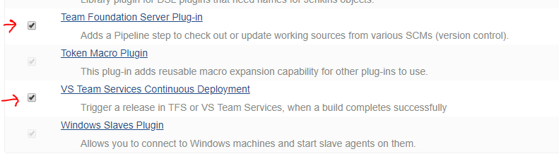 Select the Team Foundation Server Plug-in and VS Team services Continuous Deployment Plugin.