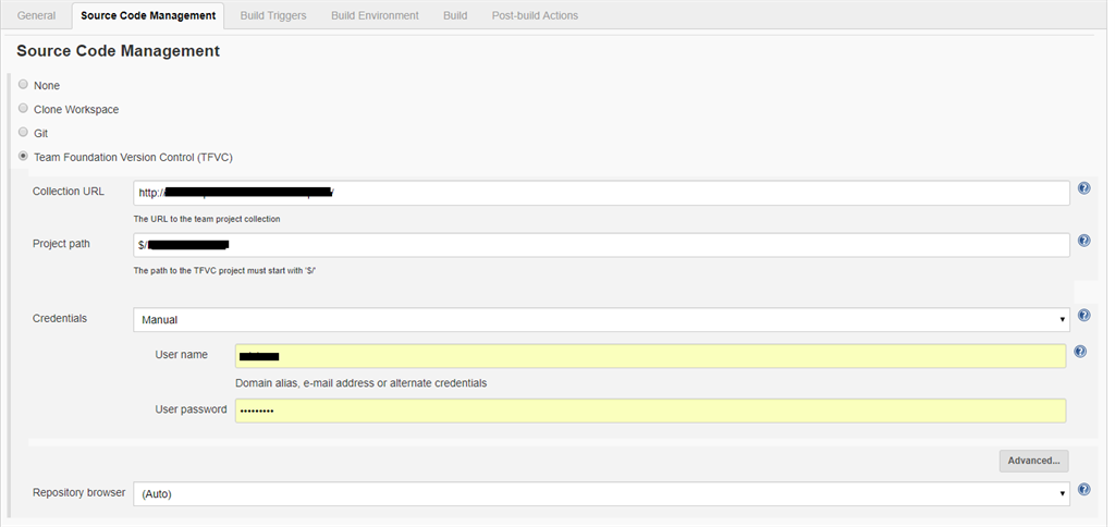 From the Source code management tab, will set the source team Foundation Version Control (TFVC).