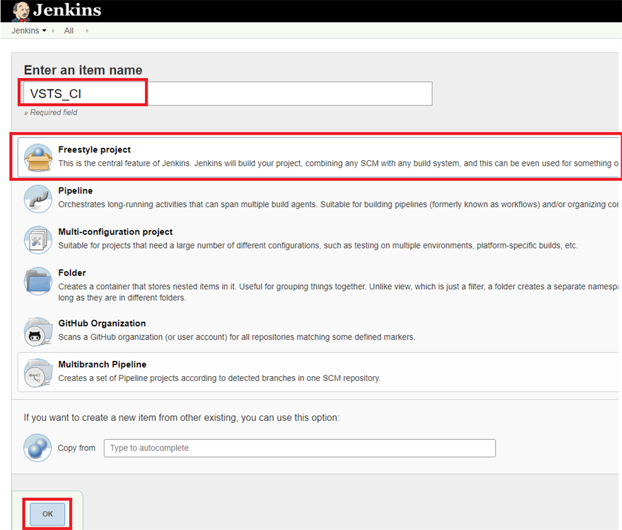 Enter the name of the item you want to create (here I have entered VSTS_CI) and then select 'freestyle project' and click on 'Ok' button.