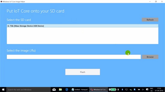 Insert your SD card on your card reader and plug into your laptop or PC with the USB port, now run the program called WindowsIoTImageHelper