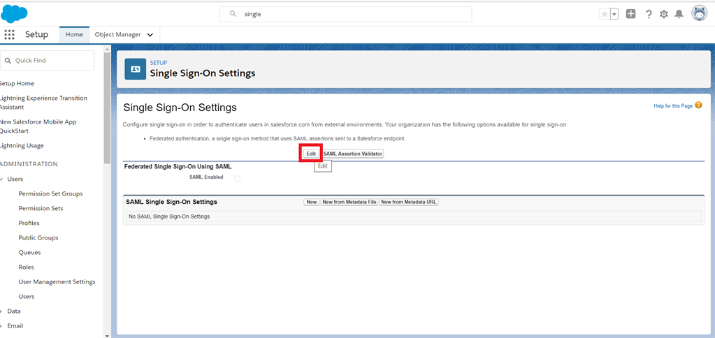 In a single sign-on page, click the “Edit” button to enable the SSO settings in Salesforce.