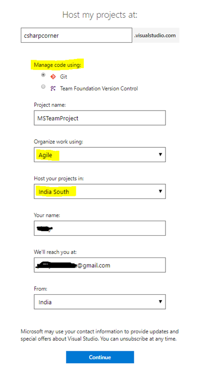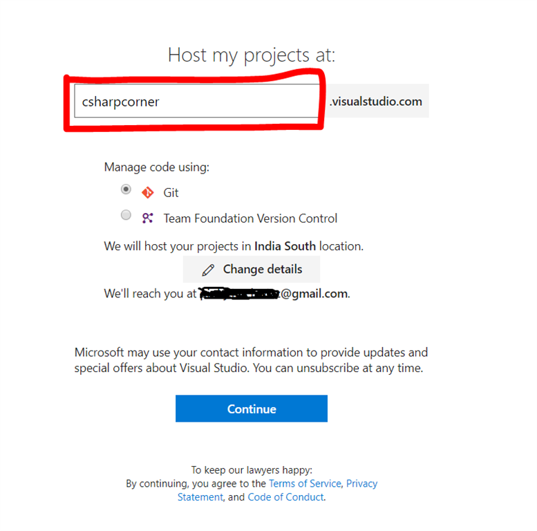 It will ask you to enter a name (host) for your team project. So like as shown in below screen I have entered name 'csharpcorner'
