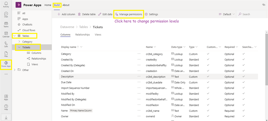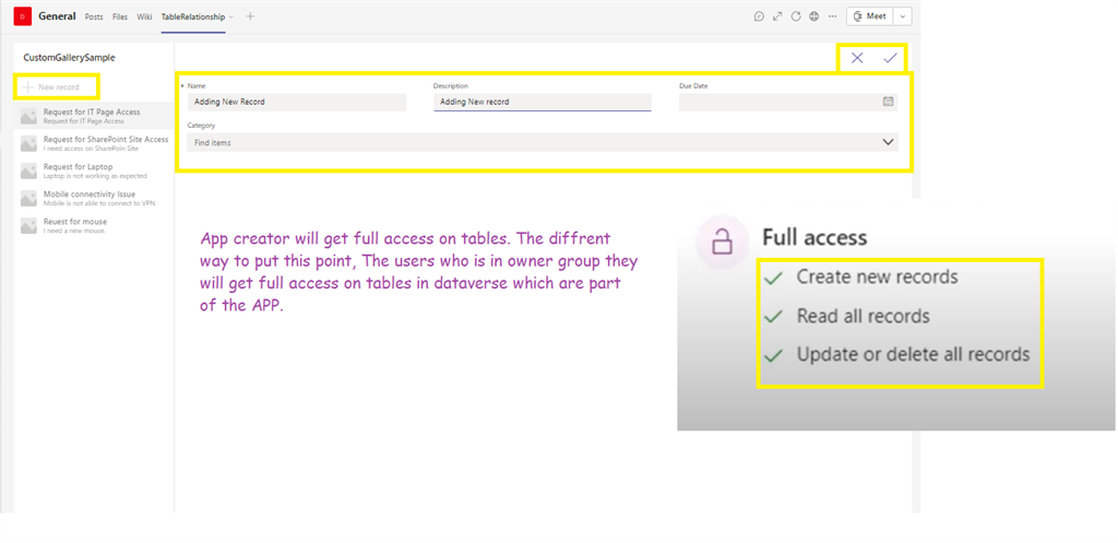 If you look at the owner logging in, the Owner has full access to all the tables which is created as part of this app. As part of apps, I have created tables in Dataverse for a Team called "Tickets" and owners have full access that means owners can add, update and delete records from the table.