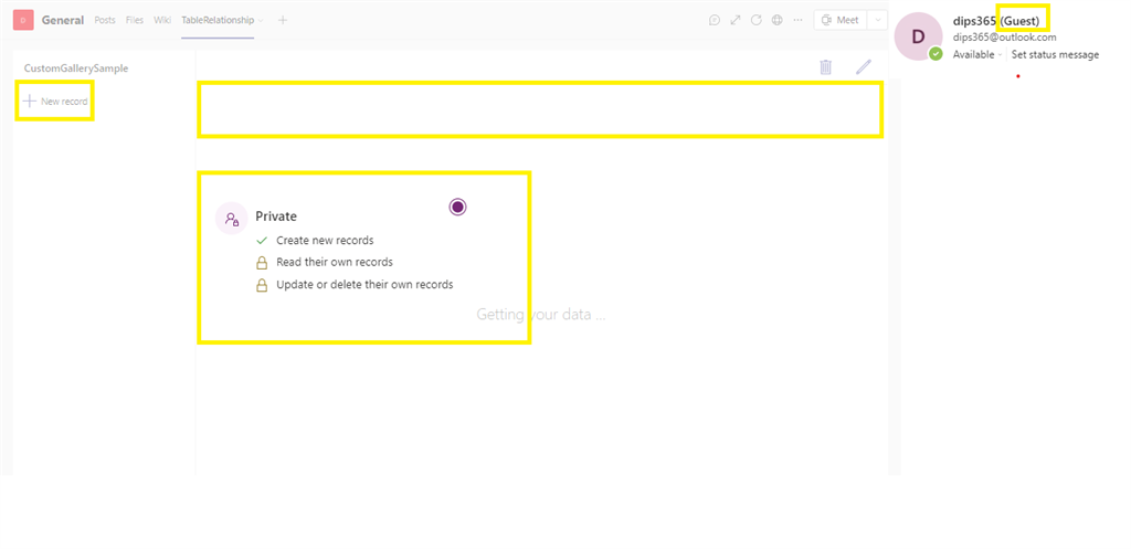 When Dips365 logs in as a guest user, Dips365 does not see any records and the reason is that guest users have private access to the tables. That means they can create new records, however they can read only records that are created by them only and they can update and delete only their own records.