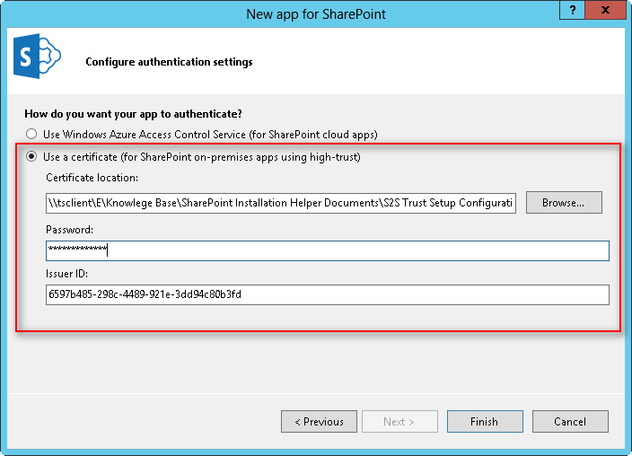 - Specify the Security Certificate details based on SharePoint Provider Hosted App Development Environment configuration.