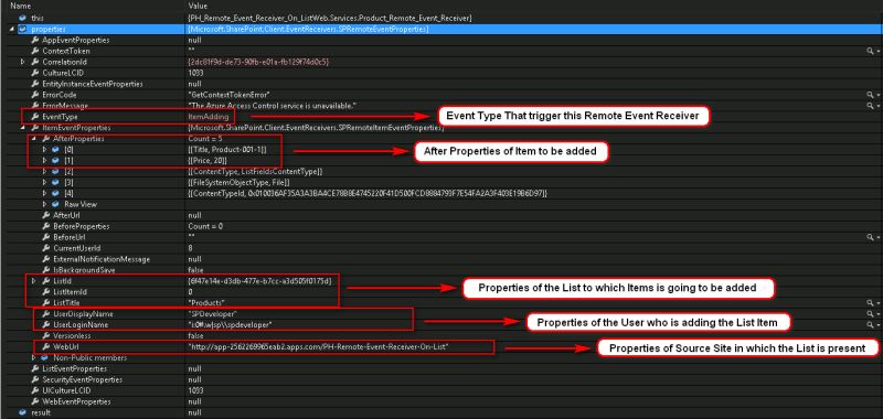 “ProcessEvent” method of Remote Event Receiver provides an object called as“properties” that exposes a lot of useful properties that can help us to perform any desired operation on the Web or List or List Item.