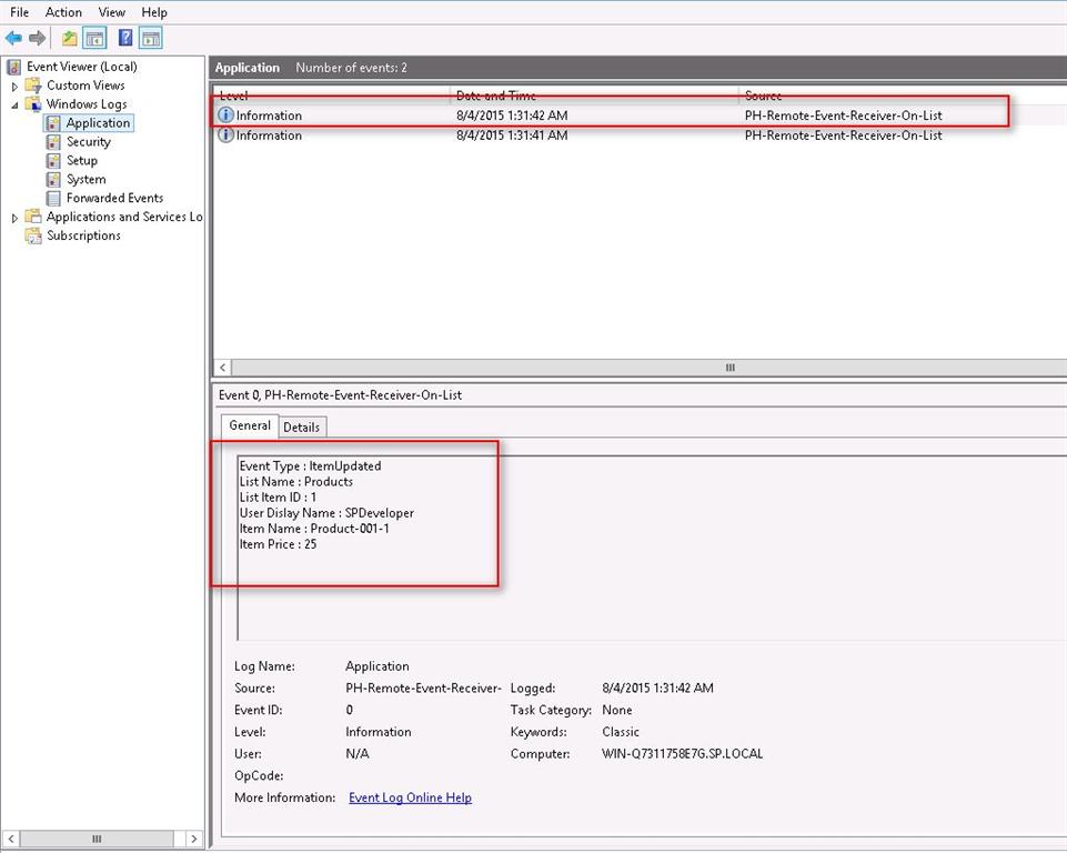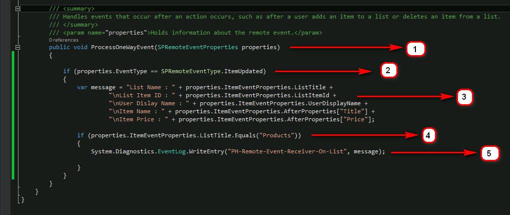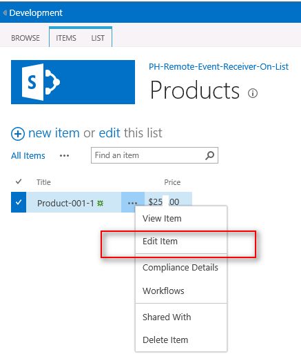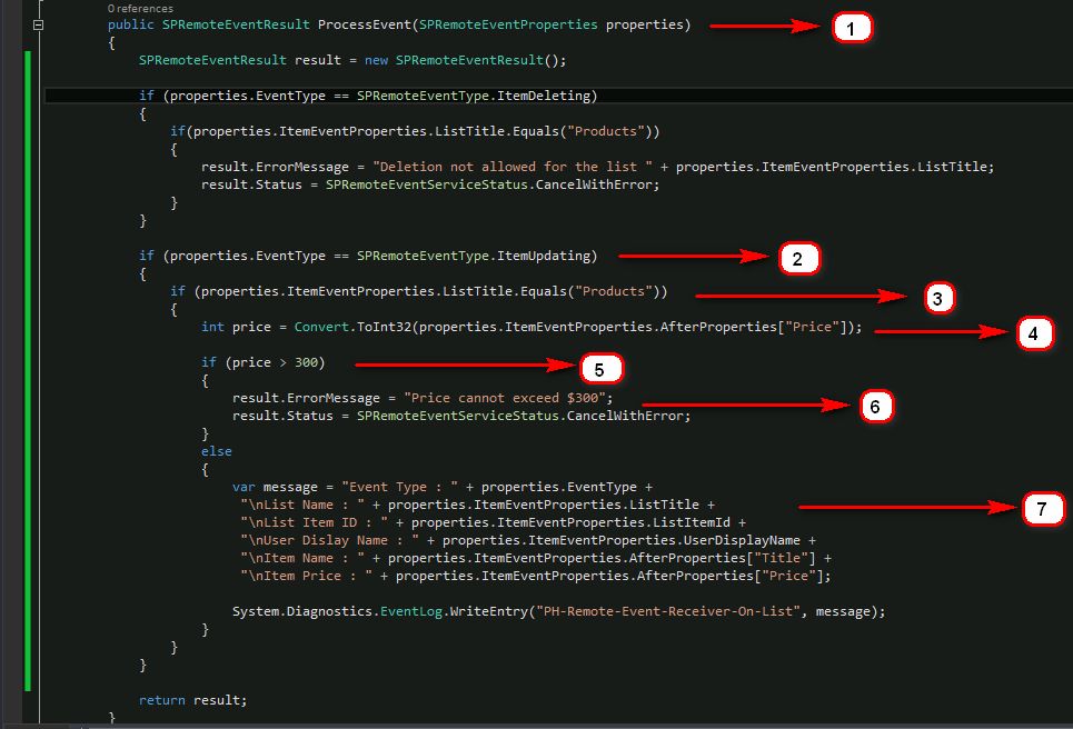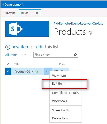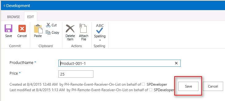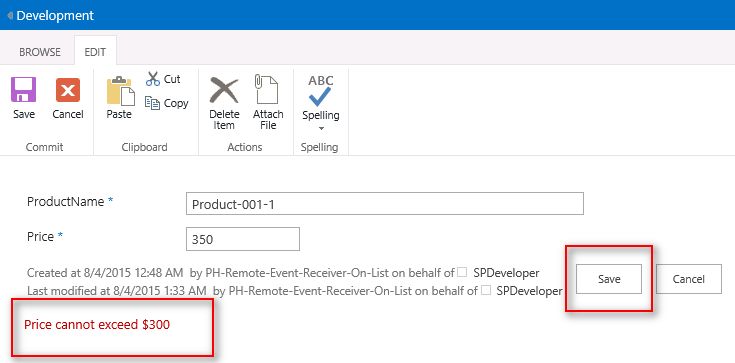 Scenario 3: How to validate User inputs using Remote Event Receivers This scenario will talk about validating user inputs and terminate the execution as soon as the input value falls outside the valid value range. For instance in this demo we are assuming a hypothetical business requirement demanding “Item Price should not exceed $300”. In order to showcase this validation scenario we can consider the same Item as mentioned above. Let’s edit the item as shown below Now specify the Item Price any greater than $300, here we are updating the Product Price as $350. As soon as we try to save the item, SharePoint hans over the control to Remote Event Receiver which is registered with this list on Item Updating Event and Event Receiver validates the Item Price value against the specified business logic which on fail produces the error message “Price cannot exceed $300” as highlighted below- If we look into the logic driving this business requirement we can see: