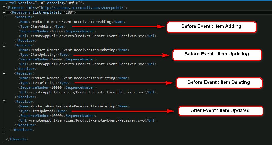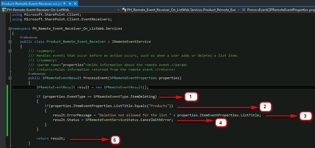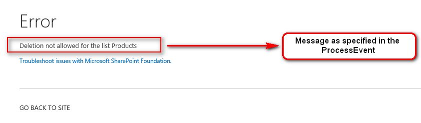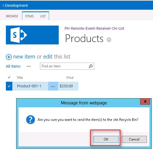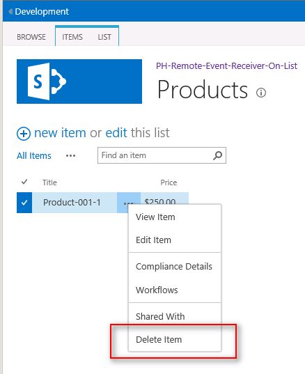 We will investigate the working of the following scenarios which are quite obvious while working with SharePoint List & List Items. Scenario 1: How to restrict users to delete a certain item In order to show case this scenario let’s consider an Item “Product-001-1” added to the List called “Products” as shown below: Now let’s try to delete this item as highlighted below- As soon as the user tries to delete the item SharePoint looks for any registered Event Receiver with the List and looks for its Receiver Definition to see what events this Receiver is allowed to receive and executes it. In our case we have registered the following Receiver Definition with the list- Let’s investigate the code for registering Remote Event Handler – Since this is a Before Event (as explained in one of the earlier post “SharePoint 2013: Remote Event Receivers”), we need to write the Code in “ProcessEvent” Method.