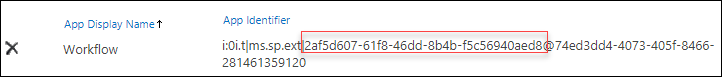 - In the site permission page, we will found all the apps which are being installed in this site, with their identifier. We need to copy the workflow client Id which is a part of the app identifier. The Client id is in between the last “|” and the “@” sign, as shown in the figure below.