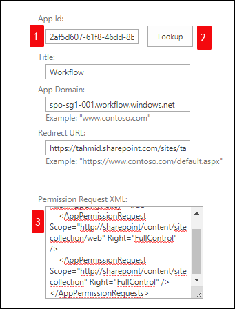 - Provide the “ClientId” in the App Id field (position 1) which we have already copied. Now, click the “Lookup” button (Position 2).