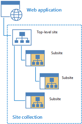 Site collection can only be created under a Web Application, and the subsite, only under Site Collection. A web application can host multiple site collections, while a site collection is only a part of single web application. Also, site collection can have multiple subsites but that can only be under a single site collection. The below picture shows the structure.
