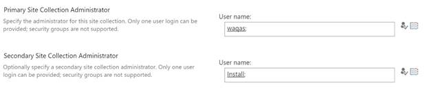 Now, enter the primary and secondary site collection administrator. A Primary administrator must have entries while you can skip the secondary site collection administrator, i.e. "waqas" as primary and "install" as secondary.