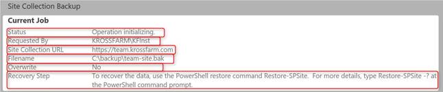 - No site collection backup is in progress. it will display no if no backup job is running; otherwise, it will show something like “A Site collection backup job is currently in progress”.