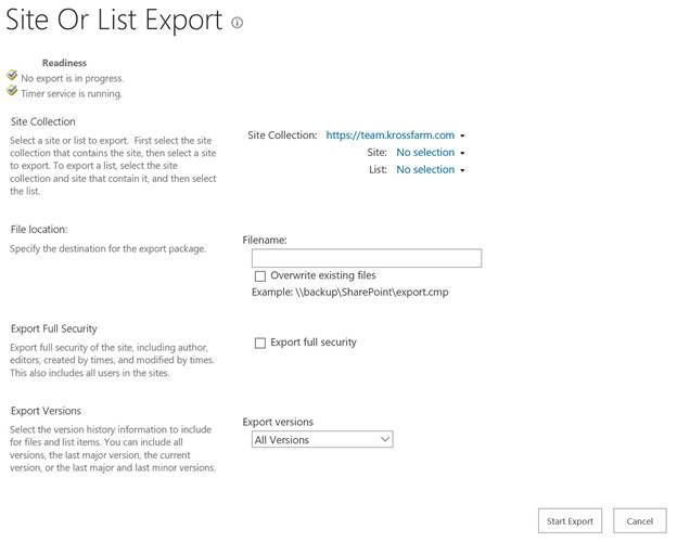 Site Or List Export Page’s direct link - /_admin/SiteAndListExport.aspx