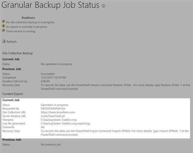 - Now, you will see the status page. This page will refresh automatically after every 30 seconds. On this page, you will check the status of the content export job. We will see success or failure status, once the job is complete.