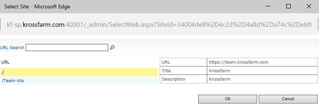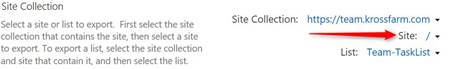 - On this popup, you will see all the subsites on the team site collection, as our list is on the root of team site collection, then we will select “/” and hit.