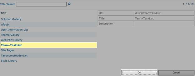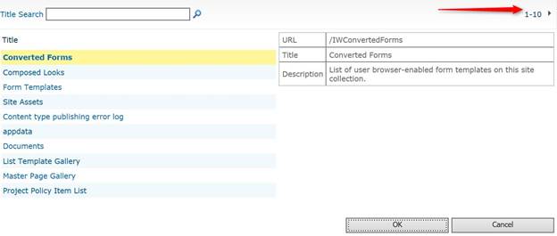 - On this popup, you will see all the list & libraries, as we want Team-TaskList but it is not on this page. We have to click on the arrow next to 1-10. By default, it displays 10 list and libraries alphabetcally.