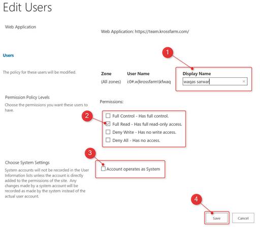 - Now, you will see the Display name changed to Waqas Sarwar and Permission level also changed to Full Read.