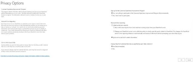 When you click on the configure privacy options link, you will land on Privacy Options. This page will allow you to configure privacy options (Customer experience improvement program, Error Reporting and Help options) for SharePoint Farm.