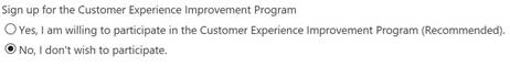 - Yes, I am willing to participate in the Customer Experience Improvement Program (Recommended).