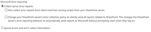 - Change your SharePoint Server's error collection policy to silently send all the reports related to SharePoint. This changes the SharePoint Server's error reporting behavior, which automatically sends the reports to Microsoft without prompting the users, when they log on.