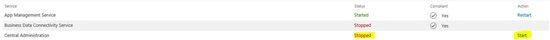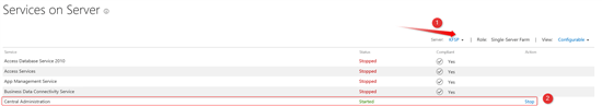 - On this Page at top right Dropdown, select the Server on which we want to provision it. Now, click on the Stop link in front of Central Administration.