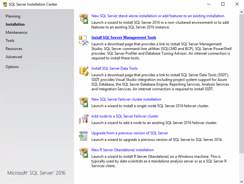 In the installation wizard, Click Install SQL server management tools link, this will open the Microsoft site for downloading the software with the latest release.