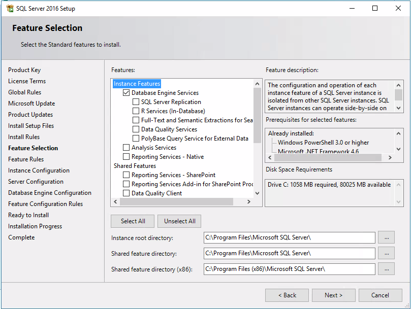 In this step, enable what features need for installation. For this, we enabled only Database Engine Services.
