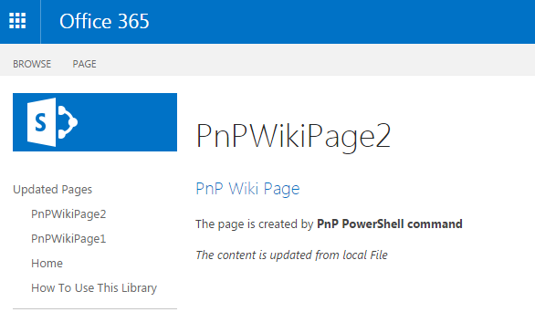 Thus, you have learned how to carry out the basic Wiki page operations on SharePoint website, programmatically, using PnP PowerShell commands. The operations like creating Wiki page with content, updating Wiki page content, retrieving Wiki page content and deleting Wiki page are explained above. PnP PowerShell is supported by SharePoint 2013, SharePoint 2016 On Premises and Office 365 versions. The operations, mentioned above, are tested on SharePoint 2013 and Office 365 environments.