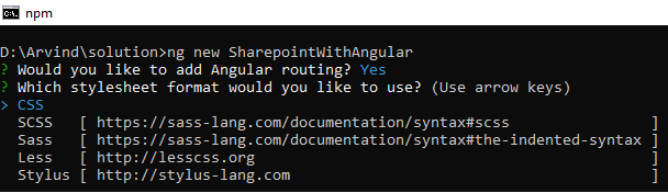Open the command prompt and type below command to create an Angular project where SharepointWithAngular is the project name.