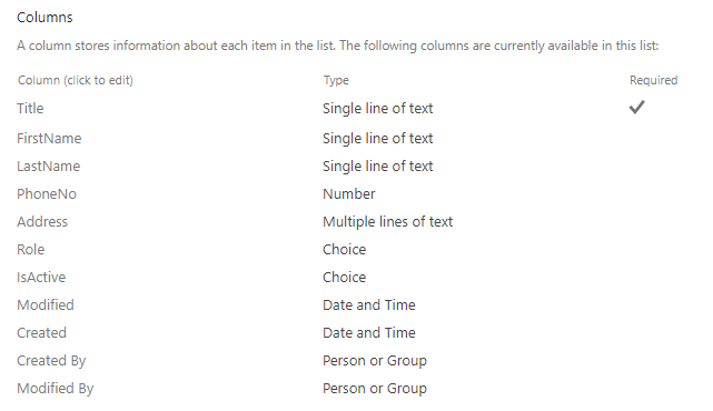 To demonstrate the CRUD operation in SharePoint online, I have created the Employee list with following the columns.