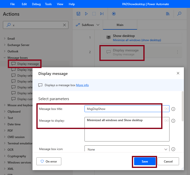 For Displaying status, Add the Display message action and Set the Message box Title Parameter as MsgDispShow, Message to display Parameter as “ minimize all windows to Show desktop” Click Save Button.