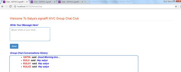 It will show SATYA user message as well as KULU , KULU1 , KULU2 user messages in Chrome browser.That way every user can see every one else's sent messages in the chat history area.