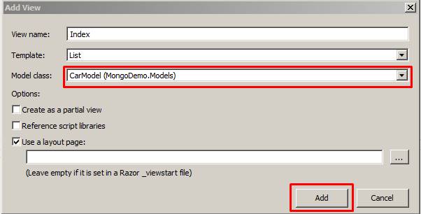 For adding Index View just right click inside Index Action Method and choose Add View from the list of the menu after choosing a new dialog will pop up with name Add View in this dialog just choose template “List” and Model class as “CarModel” click on Add button.