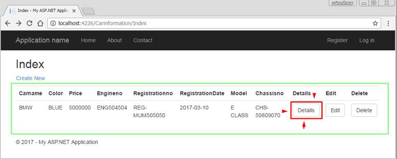 After clicking on Details button it will call Details Action Method which takes Objectid as input parameter and on basis of that parameter it gets data from MongoDB database to display data.
