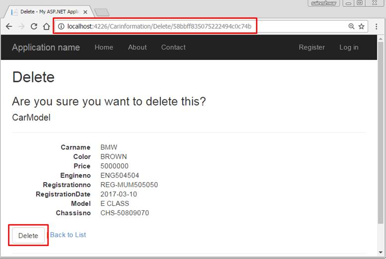 Now in this process we are first going to open index view from there we are going to click on Delete button then delete action method will get called which take Objectid as input parameter and then we are going to pass this parameter to create mongo query then this query will be passed to GetCollection method to get Car model data.