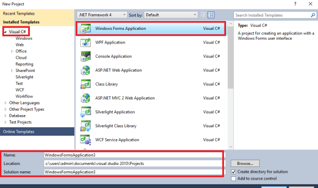 By selecting a new project you will be opened up with a new window where all the developing templates are available as options. Here you can select C# Windows Form application and save the application name. After typing the application name select OK which will take you into the Windows work area.