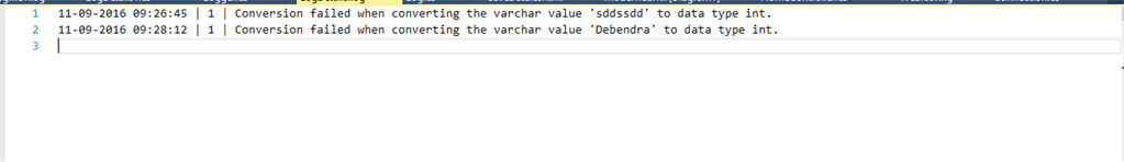 To raise an error, I will make some logic change as I will try to insert the name in RollNo column also. Thus the error will be captured and is shown as follows-