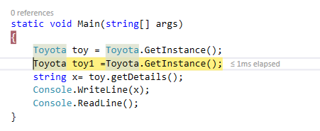 The implementation here is straightforward. The constructor of Toyota is private. Thus, it is not possible to instantiate it from outside. The only way to get an instance is to call static GetInstance() method. GetInstance() first checks, whether an instance is already created or not. If not, then it creates an instance, refersit via private static member instance and then returns it. If already created, it returns the previously created instance. Thus, the first call GetInstance() instantiates a Toyota object only and any further call returns the same object. Also note, the object is not instantiated until GetInstance() is called, i.e. we only create, when actually required.
