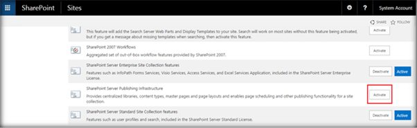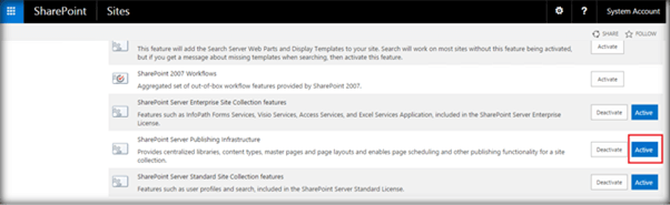 Output - Thus, the site collection "Publishing" feature has been enabled, as shown below.