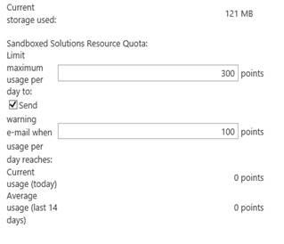 Here, you can configure how many sandboxed code solutions should be executed within the site and you can send warning E-mails, when a quota limit for the site has reached.