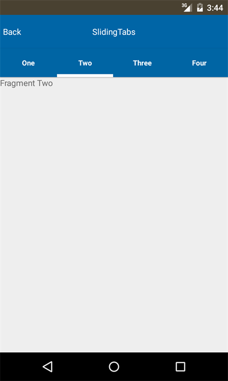 Here, I have an action bar with the left side. There is a back button and in the center, it's showing the application title. Below that, it's showing the tabs. Each tab has a scrolling facility, in order to change the content. We can do click operations to the tabs.