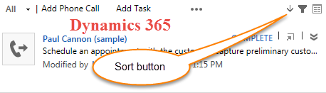 Ok, if we are thinking, can we customize it now, unfortunately the answer is still no. But we have good news, although we can’t customize social pane, at least we have a new feature in Dynamics 365 to sort activity list. You will notice in social pane now we have a sort button like the following,